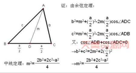 后来我就上网查查,好家伙,还真有“三角形中线定理”这么个东西:AB² + AC² = 2AD² + ½BC²。