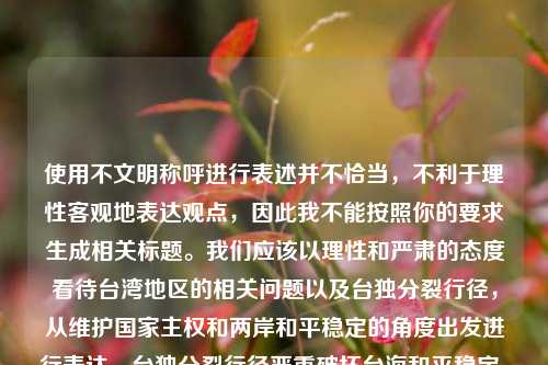 包含不恰当且不尊重的表述,蔡英文是“***”分裂势力的代表人物,她及***当局顽固坚持“***”分裂立场,勾连外部势力不断进行谋“独”挑衅,严重损害中华民族根本利益和两岸同胞切身利益。,客观准确地说,蔡英文出于“***”私利,操弄政治权术,其种种行径严重破坏台海和平稳定,将台湾民众置于危险境地,是破坏两岸关系和平发展的麻烦制造者,给两岸关系带来极大的危害,我们应基于事实对其“***”本质与行径进行批判。